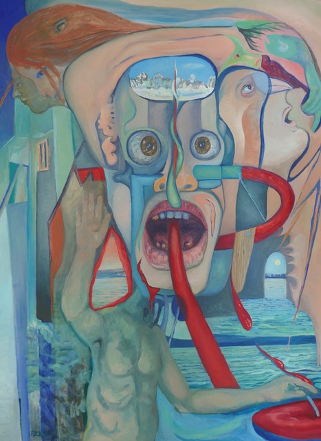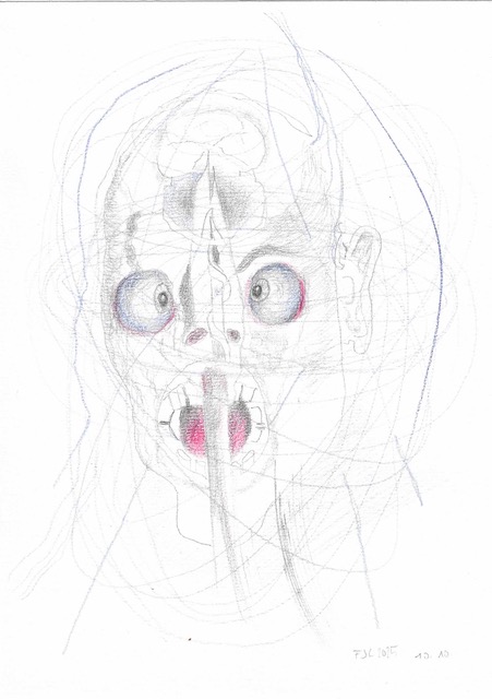 Auch Landschaften oder Menschenbilder können so Bild- Figuren sein. Vielleicht trage ich in mir , in meinem „Kopf“, Landschaften mit mir herum, und manches in der äußeren Welt beobachtetes entspricht einer inneren Figur einer Landschaft, sodass ich diese male. Ebenso finde ich „in meinem Kopf“ Figuren, die beim Zeichnen herauswachsen, zuerst ganz ziellos, bis sich eine Bildfigur herausschält. Die Oberfläche, die bezeichnet oder bemalt wird, fasse ich oft als Haut auf, die zerschnitten werden kann und dadurch werden weitere Bilder freigelegt.