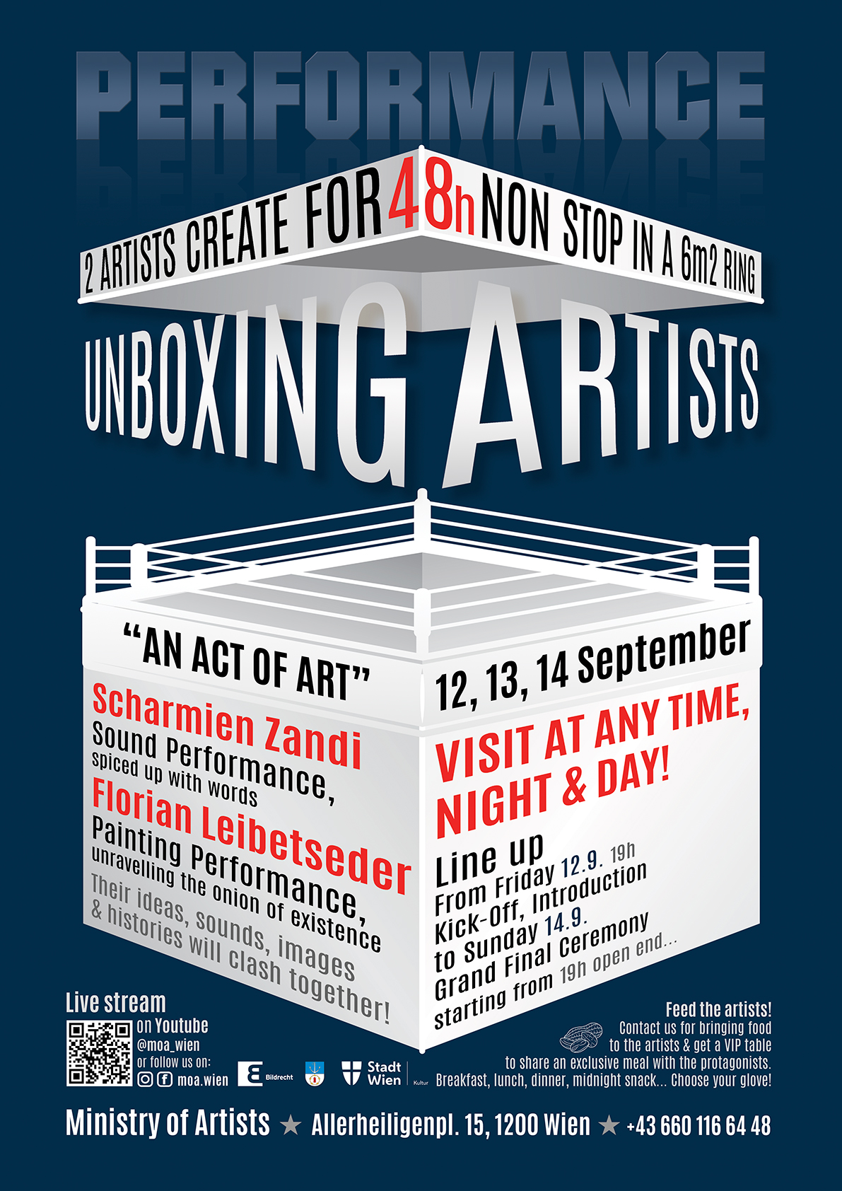 In dieser 48h Performance begegnen sich zwei Künstler:innen verschiedener Disziplinen und Generationen im “Boxring”, leben und schaffen gemeinsam – ergebnisoffen und prozessorientiert, im Austausch mit dem Publikum. Everything can happen!